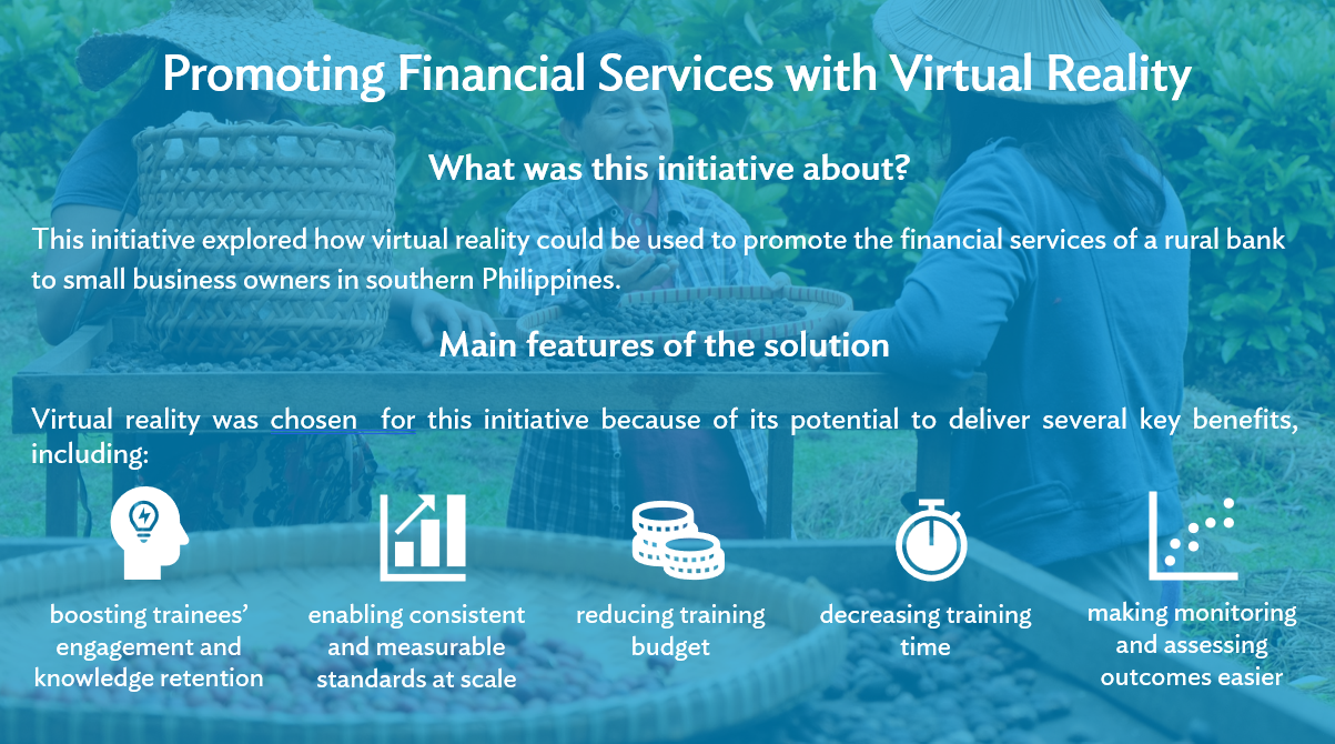 This initiative explored how VR could improve financial literacy in the Philippines. XRGlobal was selected to implement the pilot because of its experience in using VR for agricultural and financial literacy training, and because it applies a gender-sensitive approach to its projects. The company reported that VR training modules could decrease training time by up to 60% on average, based on previous projects.